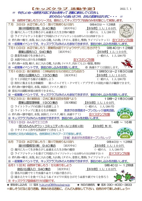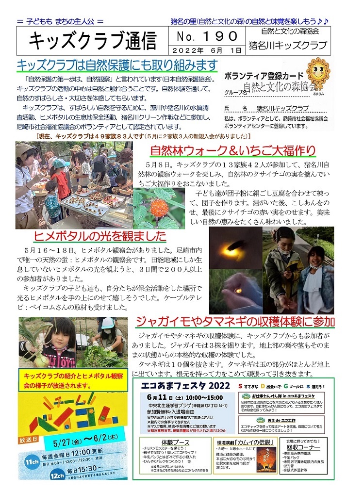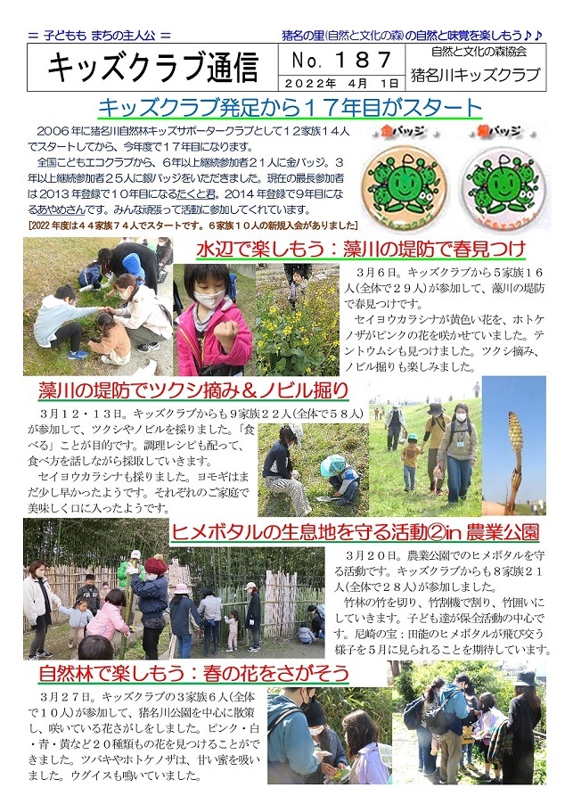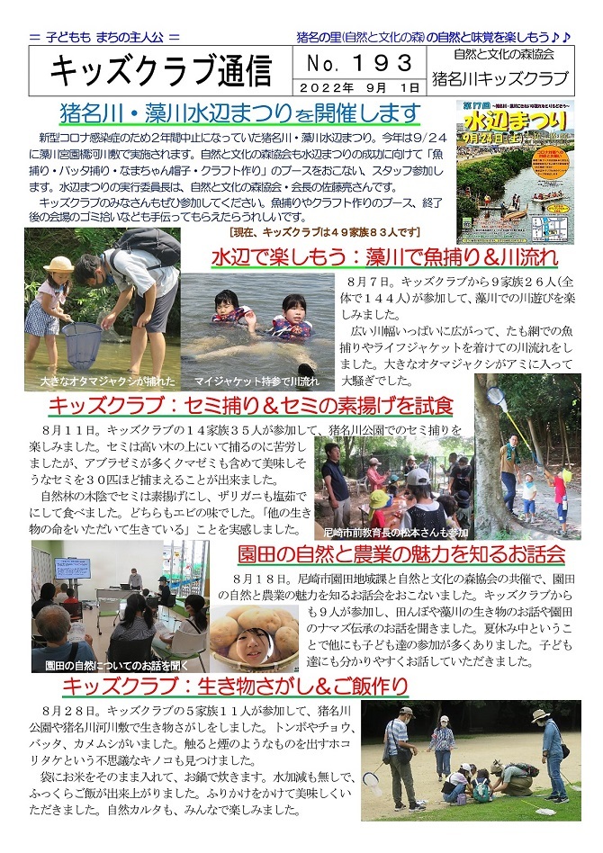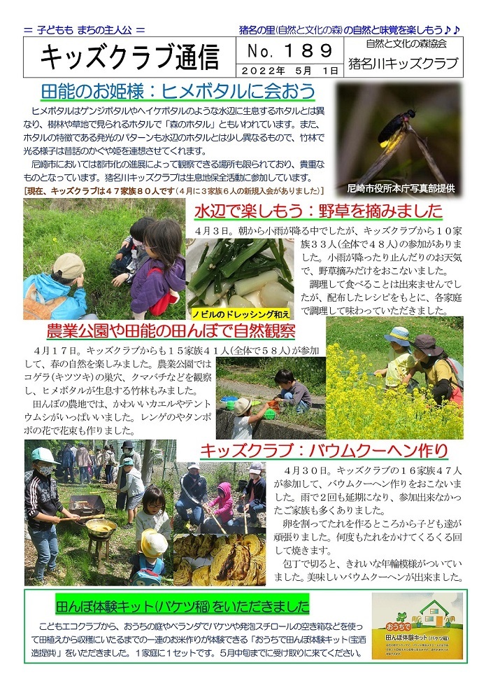 イベントによっては一般参加者の募集もおこなっていますが、新型コロナウィルス感染症対策のため、猪名川キッズクラブ会員以外の方の参加は、事前の申し込みをお願いしています。猪名川キッズクラブは2006年に発足し、「自然の中で楽しみたい! 自然を知りたい!」という子ども達が入会(登録)し活動に参加しています。10月末現在で、50家族85人の子ども達(幼児〜高校生)が登録して活動に参加しています。家族の触れ合いの場や親御さんの交流の場としても楽しんでもらっています。新型コロナ感染症対策もあり、2022年度の猪名川自然林での活動は一般募集をせずにキッズクラブ会員のみで行う予定にしています。