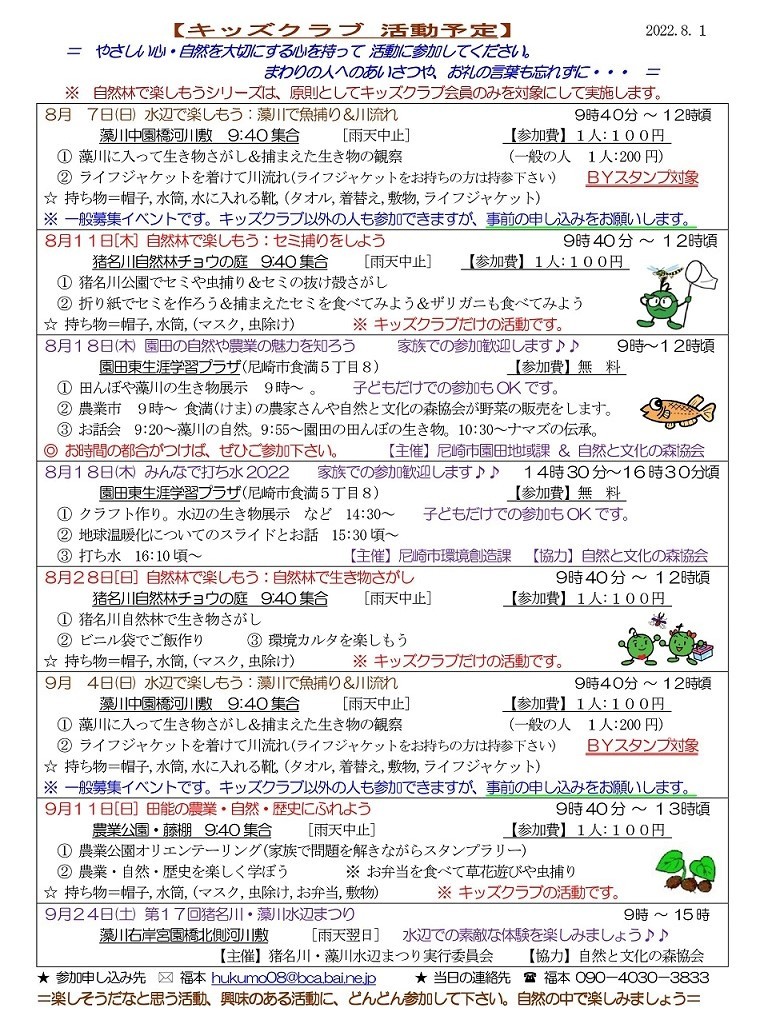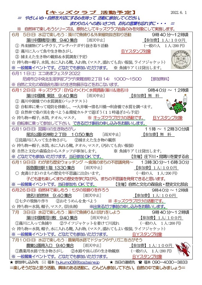 猪名川キッズクラブは、幼児から高校生までが対象で尼崎市外居住の方もOKです。体験参加も歓迎します。高校生・大学生・元気な中高年などのボランティアスタッフも歓迎します。お問い合わせなどは、下記までご連絡ください。